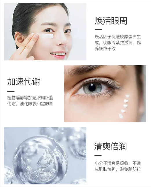 產品介紹:微振按摩有利于促進快速吸收,舒緩眼周,含豐富海藻彈潤精華,持潤沁透肌膚,幫助撫平眼部肌膚,充盈彈潤,煥活眼周活力。